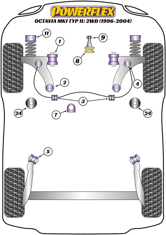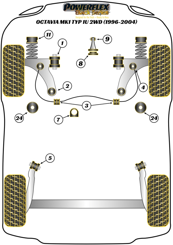 Skoda Octavia Mk1 Typ 1U 2WD (1996 - 2004)Front Anti Roll Bar Link Bush KitFits plastic link rods only, for aluminium link rods use PFF85-412. Not for link rods with ball joints on the ends. Bush Size: OEM Part Numbers: 1J0411315K, 1J0411315H, Quantity: 2 Bush(es) / Required per Car = 2 Bush(es)Road Series Part Number = PFF85-413Black Series Part Number = PFF85-413BLKRoad EAN Reference Number: 5055676550620, Black EAN Reference Number: 5055676550637Diagram Reference = 4NOTES:-See above pictures and car diagrams as applicable.Road Series - For Road and fast Road use. Improve your cars’ road holding and chassis performance by controlling the amount of unwanted flex in the suspension. They offer Prolonged tyre life, Improved performance, Increased safety, Greater cost-effectiveness.Black Series- For Track and Motorsport use. Manufactured using Black 95 Shore A compound to provide maximum control of chassis geometry. They are designed for the Track, ready to Race and are engineered to be the best.Fitting Instructions: Road Series - Black Series