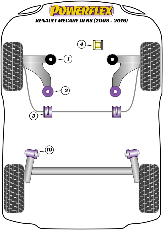 Renault Megane III RS (2008 - 2016)Rear Beam Mounting BushBush Size: OEM Part Numbers: 8200038243, 550445344R, 550450007R / 550440043RQuantity: 2 Bush(es) / Required per Car = 2 Bush(es)Road Series Part Number = PFR60-510Black Series Part Number = PFR60-510BLKRoad EAN Reference Number: 5055676530226, Black EAN Reference Number: 5055676530233Diagram Reference = 10NOTES:-See above pictures and car diagrams as applicable.Road Series - For Road and fast Road use. Improve your cars’ road holding and chassis performance by controlling the amount of unwanted flex in the suspension. They offer Prolonged tyre life, Improved performance, Increased safety, Greater cost-effectiveness.Black Series- For Track and Motorsport use. Manufactured using Black 95 Shore A compound to provide maximum control of chassis geometry. They are designed for the Track, ready to Race and are engineered to be the best.Fitting Instructions: Road Series N/A - Black Series N/A