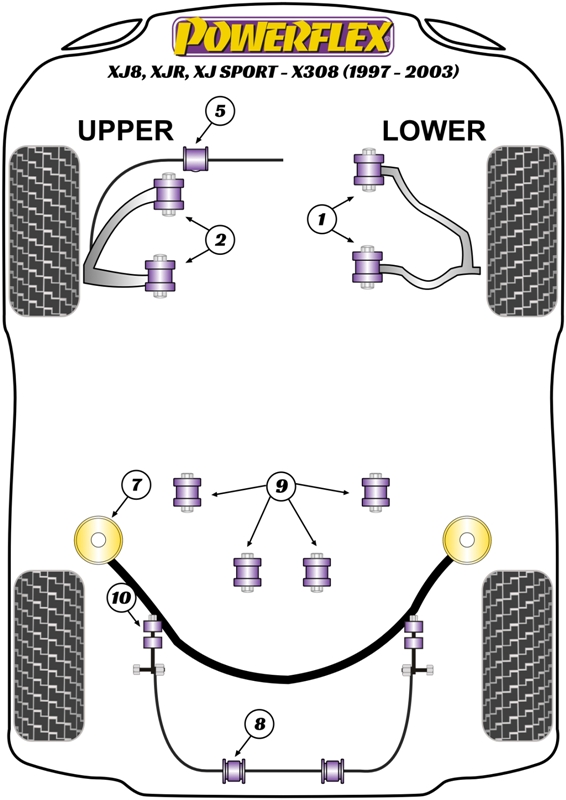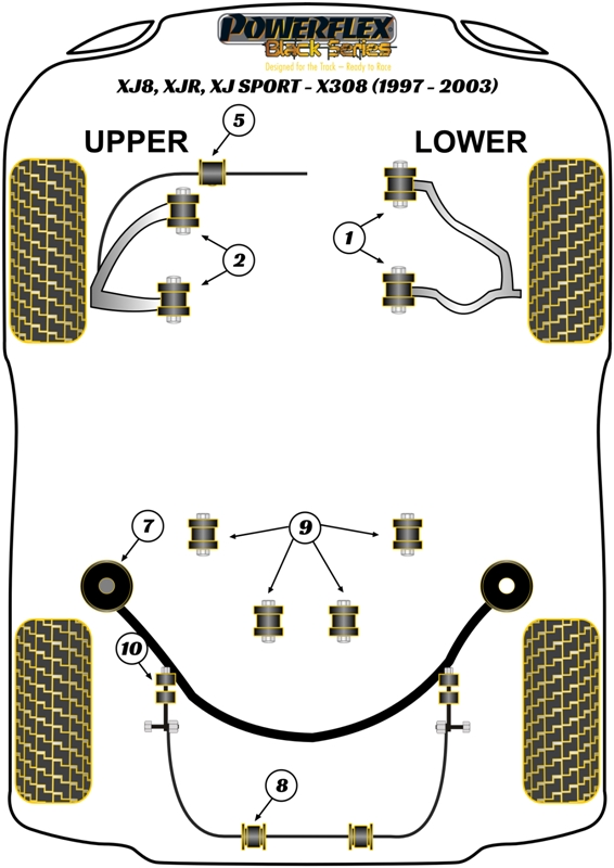 Jaguar (Daimler) XJ8, XJR, XJ Sport - X308 (1997 - 2003)Rear Beam Mounting BushBush Size: OEM Part Numbers: MJA2595AC Quantity: 2 Bush(es) / Required per Car = 2 Bush(es)Road Series Part Number = PFR27-207Black Series Part Number = PFR27-207BLKRoad EAN Reference Number: 5055676504357, Black EAN Reference Number: 5055676523969Diagram Reference = 7NOTES:-See above pictures and car diagrams as applicable.Road Series - For Road and fast Road use. Improve your cars’ road holding and chassis performance by controlling the amount of unwanted flex in the suspension. They offer Prolonged tyre life, Improved performance, Increased safety, Greater cost-effectiveness.Black Series- For Track and Motorsport use. Manufactured using Black 95 Shore A compound to provide maximum control of chassis geometry. They are designed for the Track, ready to Race and are engineered to be the best.Fitting Instructions: Road Series - Black Series