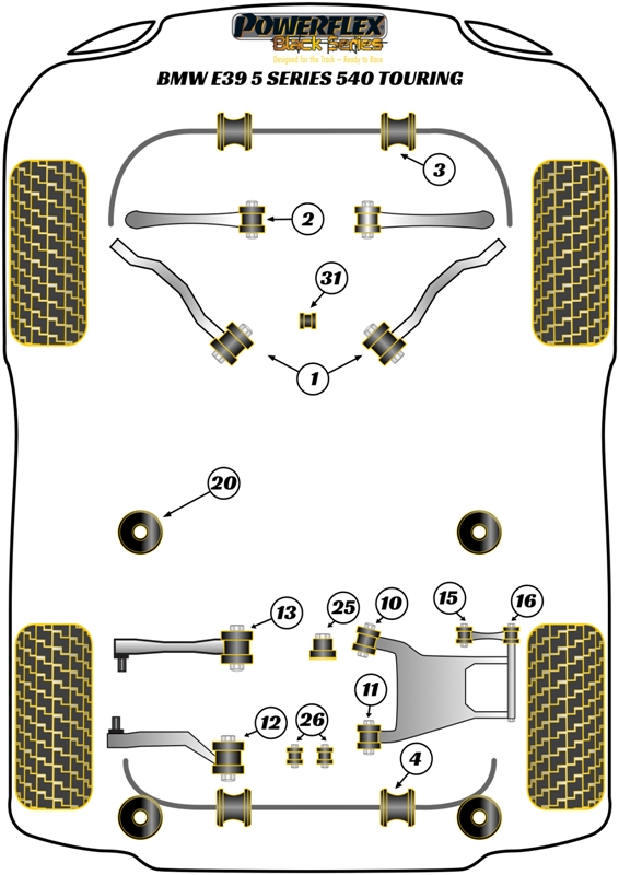 BMW 5 Series E39, 540 Touring (1996 - 2004)Rear Outer Integral Link Upper BushBush Size: OEM Part Numbers: 33326770749 Quantity: 2 Bush(es) / Required per Car = 2 Bush(es)Road Series Part Number = PFR5-715Black Series Part Number = PFR5-715BLKRoad EAN Reference Number: 5055676519399, Black EAN Reference Number: 5055676520753Diagram Reference = 15NOTES:-See above pictures and car diagrams as applicable.Road Series - For Road and fast Road use. Improve your cars’ road holding and chassis performance by controlling the amount of unwanted flex in the suspension. They offer Prolonged tyre life, Improved performance, Increased safety, Greater cost-effectiveness.Black Series- For Track and Motorsport use. Manufactured using Black 95 Shore A compound to provide maximum control of chassis geometry. They are designed for the Track, ready to Race and are engineered to be the best.Fitting Instructions: Road Series - Black Series