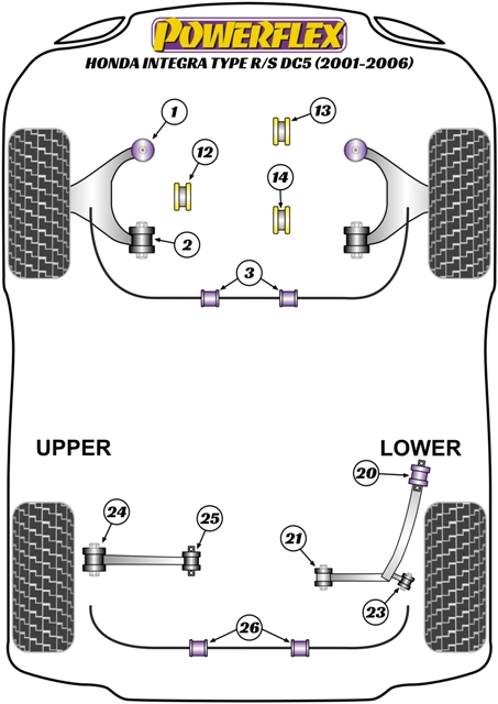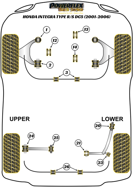 Honda Integra Type-R/S DC5 (2001 - 2006)Upper Gearbox Mount Bush InsertFits Type-R only. This bush is an insert and to be used with the original rubber bush. Bush Size: OEM Part Numbers: 50805-S6M-J01 Quantity: 1 Bush(es) / Required per Car = 1 Bush(es)Road Series Part Number = PFF25-312Black Series Part Number = PFF25-312BLKRoad EAN Reference Number: 5055676504241, Black EAN Reference Number: 5055676514783Diagram Reference = 12NOTES:-See above pictures and car diagrams as applicable.Road Series - For Road and fast Road use. Improve your cars’ road holding and chassis performance by controlling the amount of unwanted flex in the suspension. They offer Prolonged tyre life, Improved performance, Increased safety, Greater cost-effectiveness.Black Series- For Track and Motorsport use. Manufactured using Black 95 Shore A compound to provide maximum control of chassis geometry. They are designed for the Track, ready to Race and are engineered to be the best.Fitting Instructions: Road Series N/A - Black Series N/A